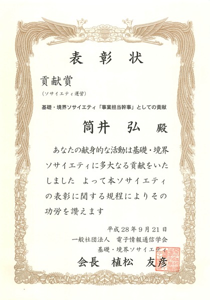 電子情報通信学会基礎・境界ソサイエティ 貢献賞(ソサイエティ運営) (平成28年)