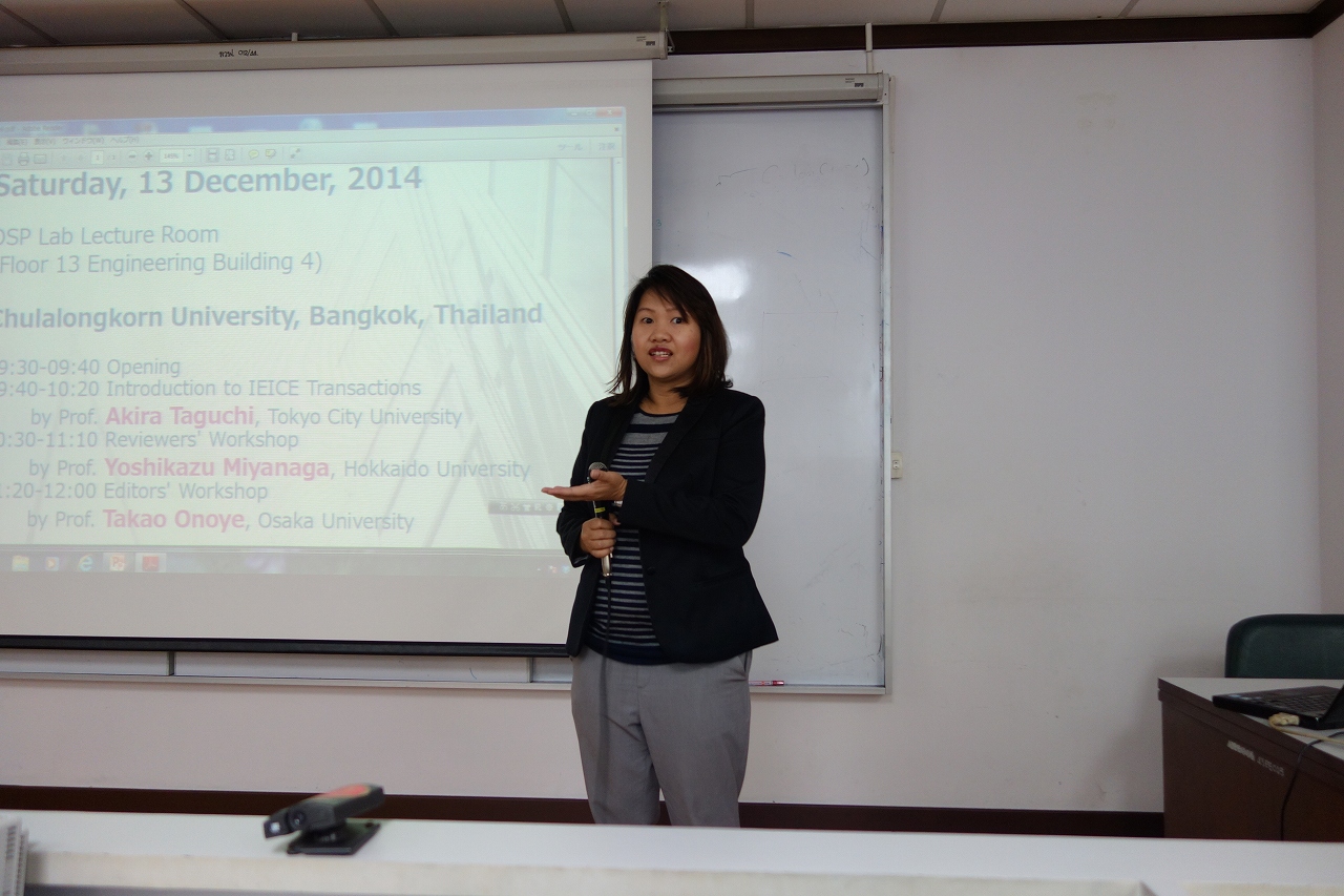 12/13(土)にタイ王国 Chulalongkorn University においてIEICE ESS主催論文編集・査読活動紹介セミナーが開催され,東京都市大学田口亮教授,大阪大学尾上孝雄教授とともに本研究室の宮永教授(IEICE ESS次期会長)が講演を行いました.